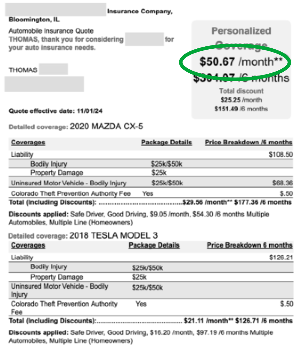 He first went to a well-known insurance company's site. After filling in the information for his Tesla and his wife's Mazda, he got a quote of $233.82/month for both cars.